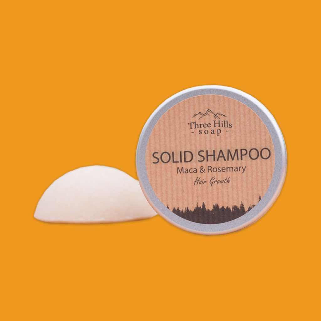 Maca & Rosemary - All Hair Types: Our concentrated solid shampoo for hair growth with powdered Maca root is designated for all hair types, especially for excessive hair loss. It is gently fragranced with Rosemary, Peppermint and a hint of Sweet Orange essential oils to refresh your hair and scalp, offering a fresh, minty, camphor-like aroma when taking a shower.